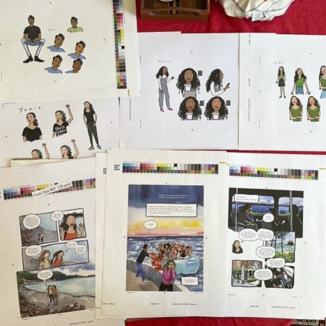 [Meera] This was truly Danica’s vision. Back in 2020, I bumped into her at a mutual friend’s book event in Brooklyn. I’d long-admired her art, and when I asked what she was up to, she told me she was working on a YA graphic novel about climate change, but she was struggling with the writing. Her first attempts felt like a textbook, she told me. “I do narrative!” I said impulsively. “Let’s talk!” As the pandemic locked us all down, we continued our conversation remotely and she brought me on to take the lead on a manuscript that she would illustrate. It’s been a wholly collaborative process, which has been such a joy for me, who usually writes in isolation once I’m done reporting a story.